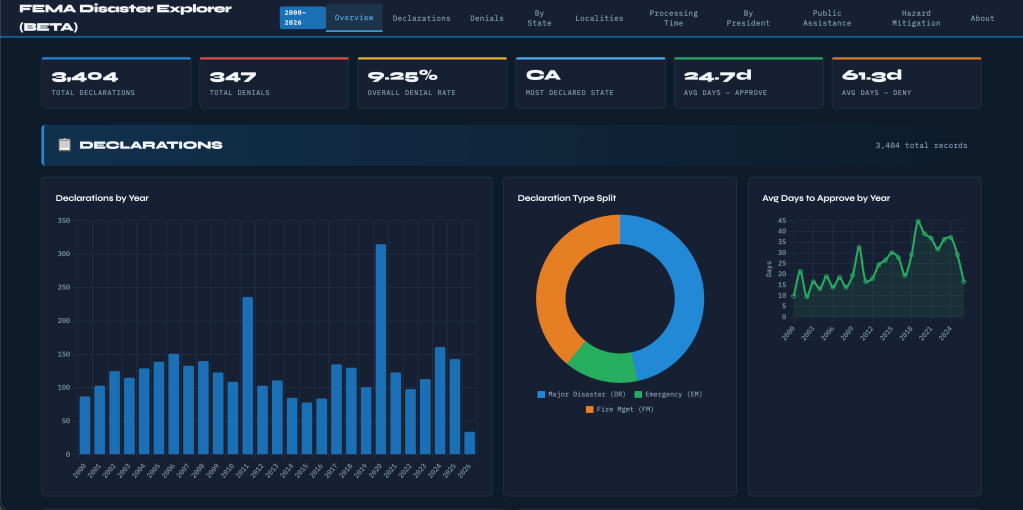 Explore $276 billion in FEMA Public Assistance obligations and $21 billion in Hazard Mitigation grants, covering every federal disaster declaration from 2000 through 2026. Search by state, county, incident type, damage category, or presidential administration. Data refreshes every Sunday directly from the FEMA OpenFEMA API.