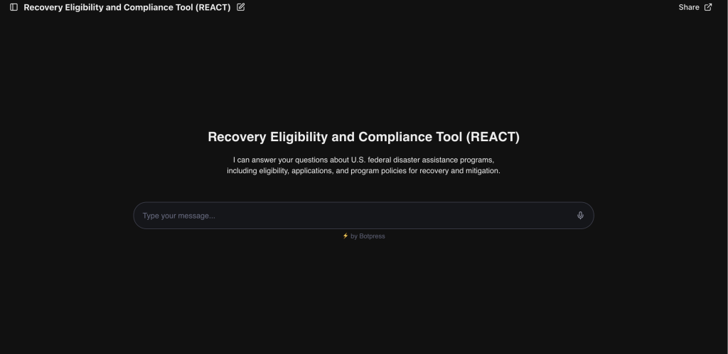 Navigating FEMA Public Assistance policy is complex. REACT is an AI-powered compliance tool built to help local governments, state agencies, and nonprofits understand eligibility, documentation requirements, and grant regulations, without wading through hundreds of pages of federal guidance.